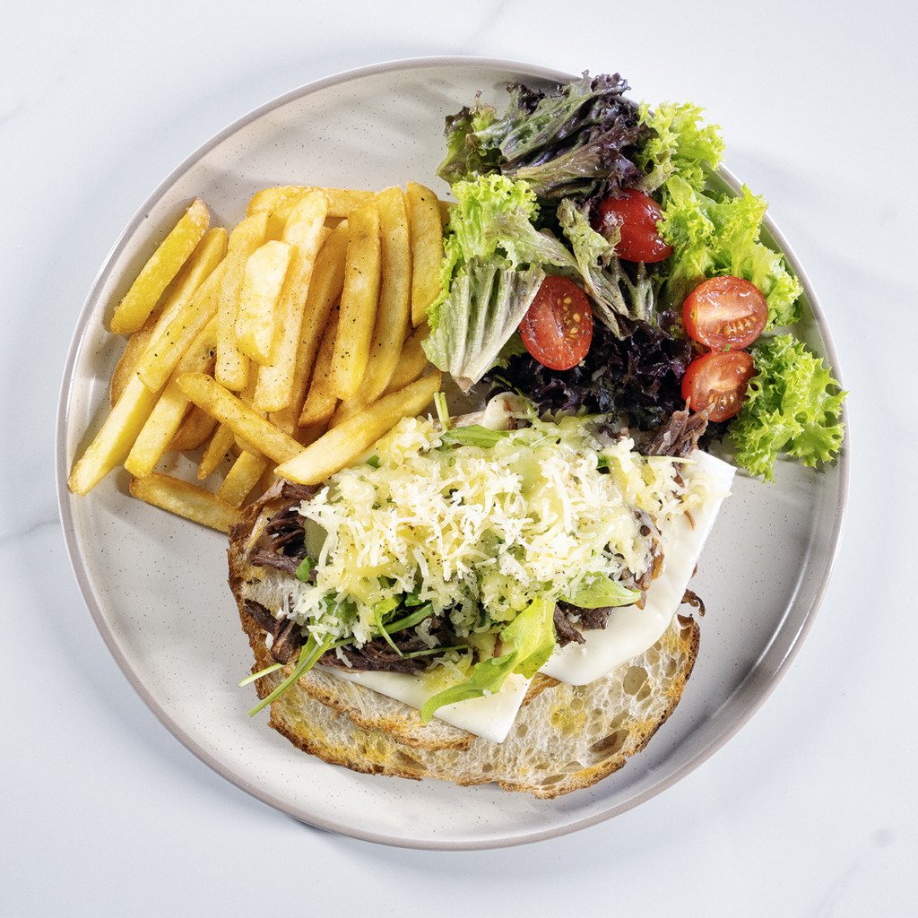 Tenderloin beef, slow-stewed until melt-in-your-mouth perfection, layered on toasted sourdough from our bakery with cheddar, mozzarella, fresh arugula, pickles, caramalised onions and a touch of Japanese mayo.